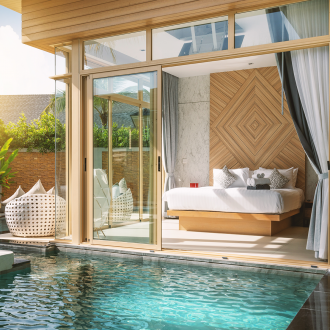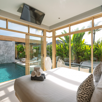 พักผ่อนในห้องกว้างสวยสไตล์โมเดิร์น สะกดทุกสายตาแขกผู้เข้าพักด้วยวิวภูเขาและวิวแม่น้ำแบบพาโนรามา ห้องเอ็กเซ็คคูทีฟ สวีท (ขนาด 71 ตร.ม.) แบ่งโซนห้องพักเป็น 2 ส่วน ทั้งส่วนห้องนอนและห้องนั่งเล่น พร้อมอ่างจากุซซี่ที่ระเบียงห้อง